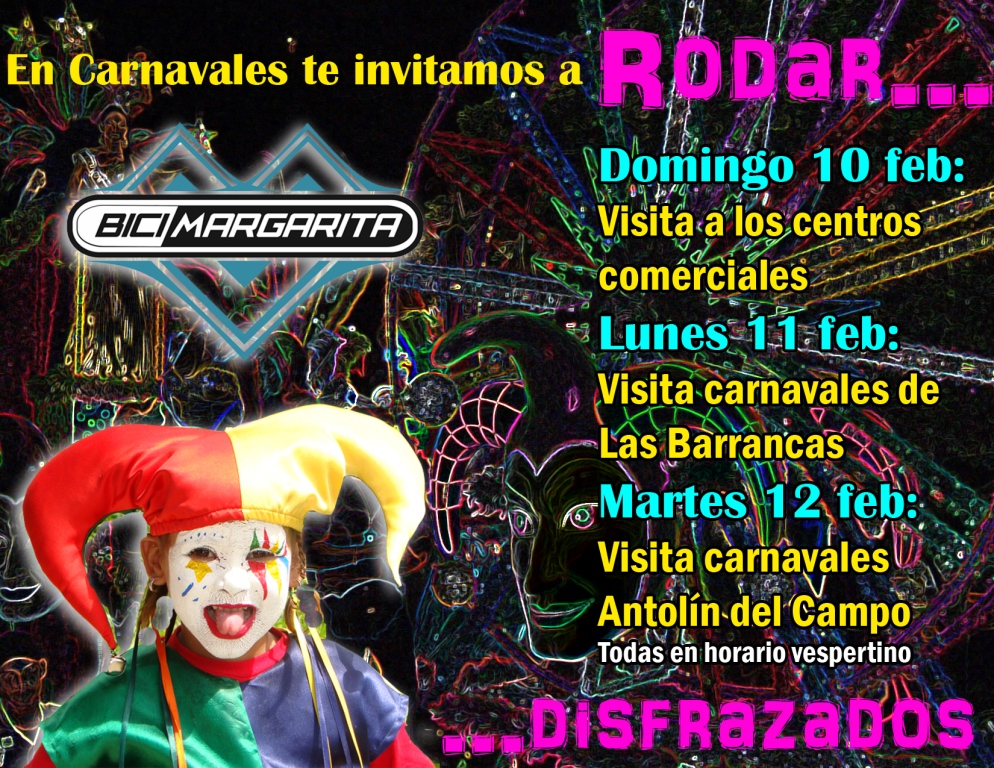 BiciMargarita invita a disfrutar los carnavales en bicicleta y disfrazados, por lo que hemos diseñado una serie de actividades para el disfrute de toda la familia. El domingo 10 de febrero estamos convocando una concentración en el estacionamiento de Rattan Plaza (frente a las atracciones mecánicas) para salir a recorrer los más importantes centros comerciales de Porlamar y Pampatar.